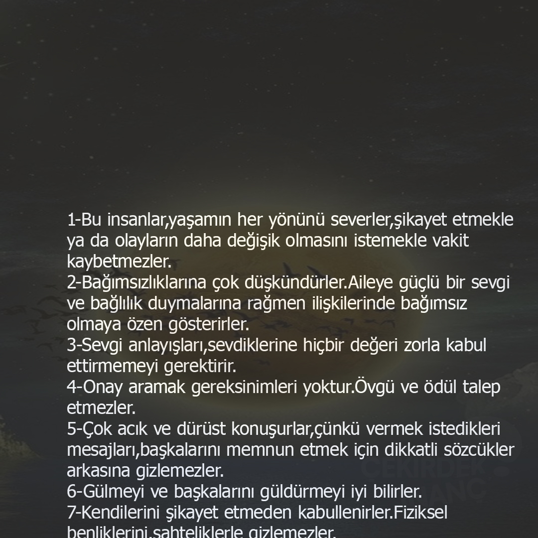 1-Bu insanlar,yaşamın her yönünü severler,şikayet etmekle ya da olayların daha değişik olmasını istemekle vakit kaybetmezler.